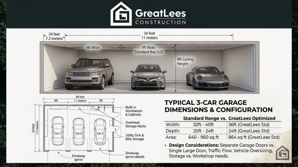 A 3-car garage is much larger than both single-car and two-car garages, providing significantly more space for vehicles and storage. While smaller garages are designed mainly for parking, a three-car garage offers additional flexibility for tools, equipment, and work areas. Because of this extra room, many homeowners prefer a 3-car garage size when building a new home or upgrading their property.