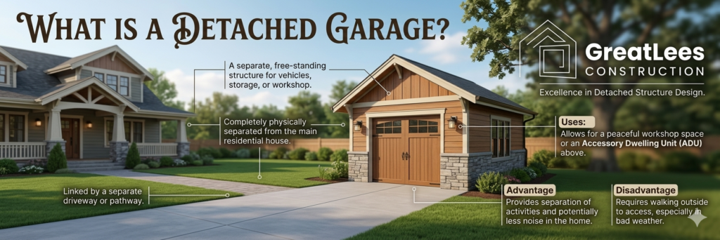 A detached garage is a standalone structure built separately from the main house, designed primarily for parking vehicles, storage, or workspace use. Unlike attached garages that share a wall or roofline with the home, a detached garage is completely independent, offering flexibility in design, placement, and functionality.